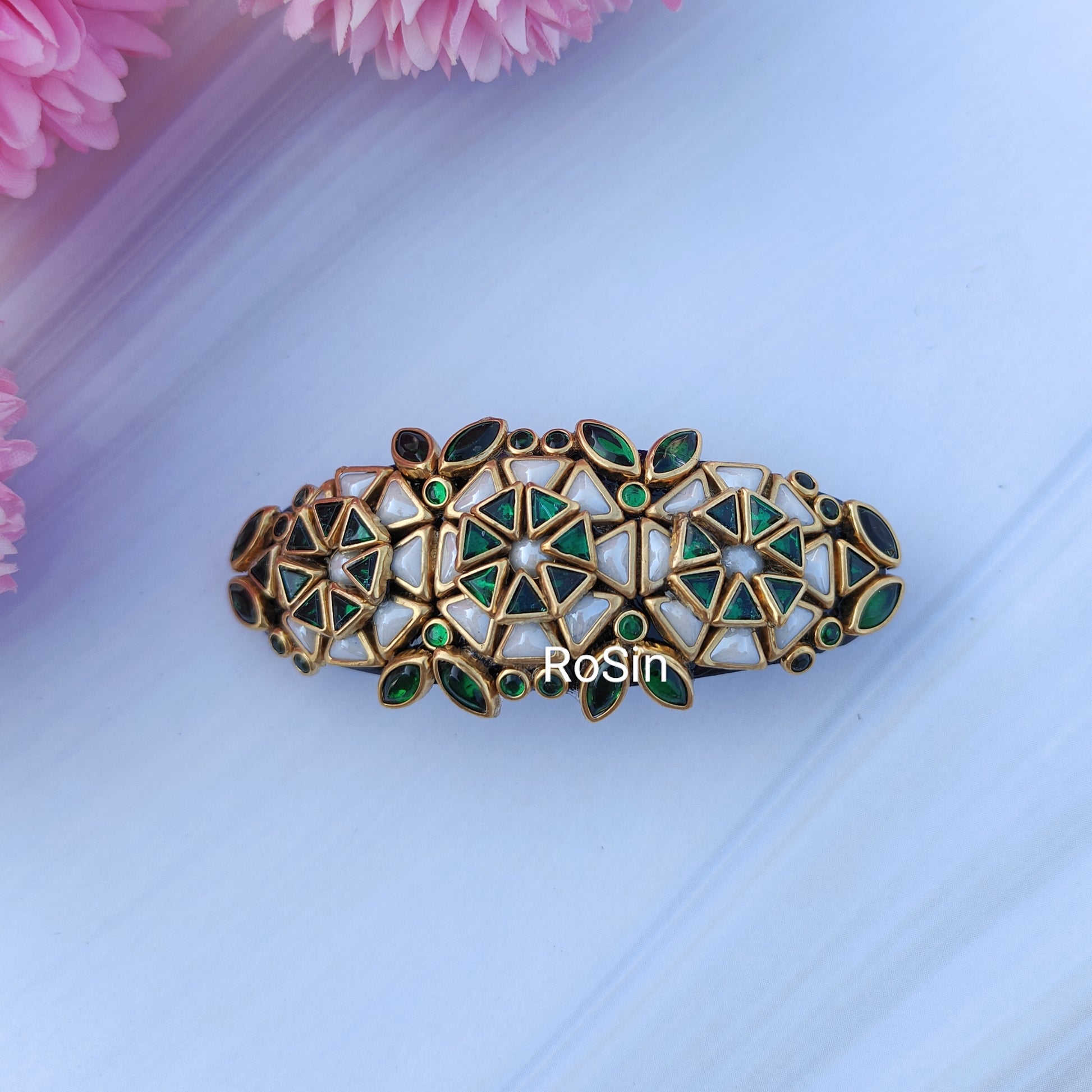 Elevate any hairstyle with our Green Triangle Floral Hair Clip. Its unique shape and vibrant color will add a touch of elegance and freshness to your look. Made with high-quality materials, it is durable and easy to use. Stand out with this beautiful accessory.