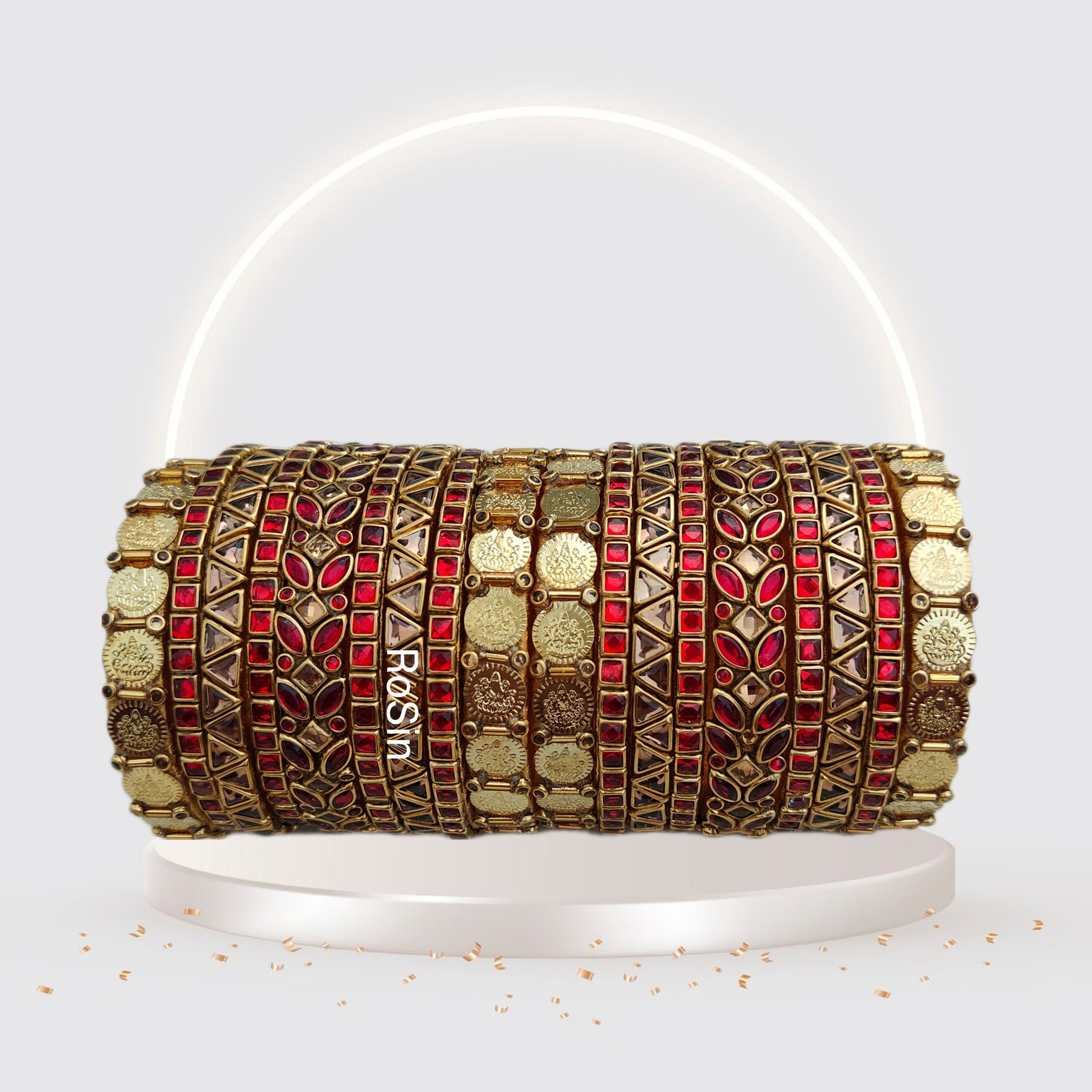 Make a statement with our Coin Leaf Red Bangles. These bangles feature a bold red hue and intricate coin leaf designs, adding a touch of elegance and flair to any outfit.