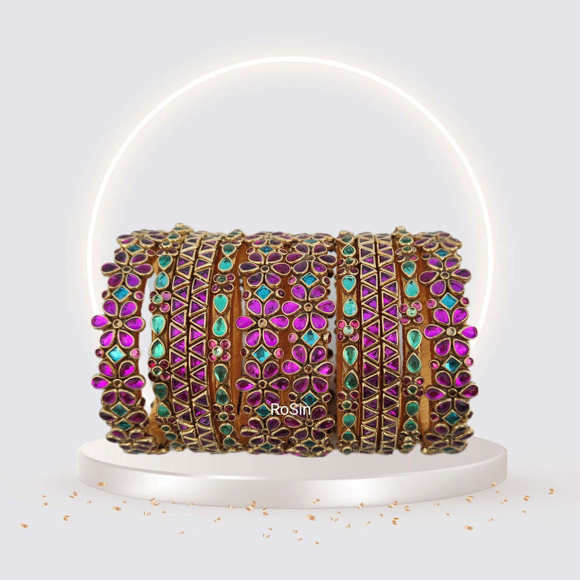 These elegant bangles feature a beautiful floral design in a dark pink and sea green color. Crafted with precision, they add a touch of sophistication to any outfit. Made with high-quality materials, these bangles are durable and long-lasting. Perfect for any occasion, they are a must-have accessory for every fashion-forward individual.
