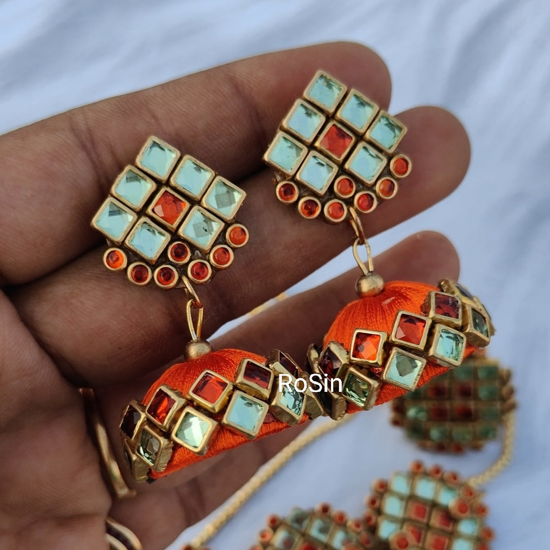 Dive into Colorful Elegance. Handcrafted with Care, These Jhumkis Combine Seagreen and Vibrant Orange Hues. Perfect for Adding a Splash of Style to Your Ensemble. Elevate Your Look with These Stunning Earrings.