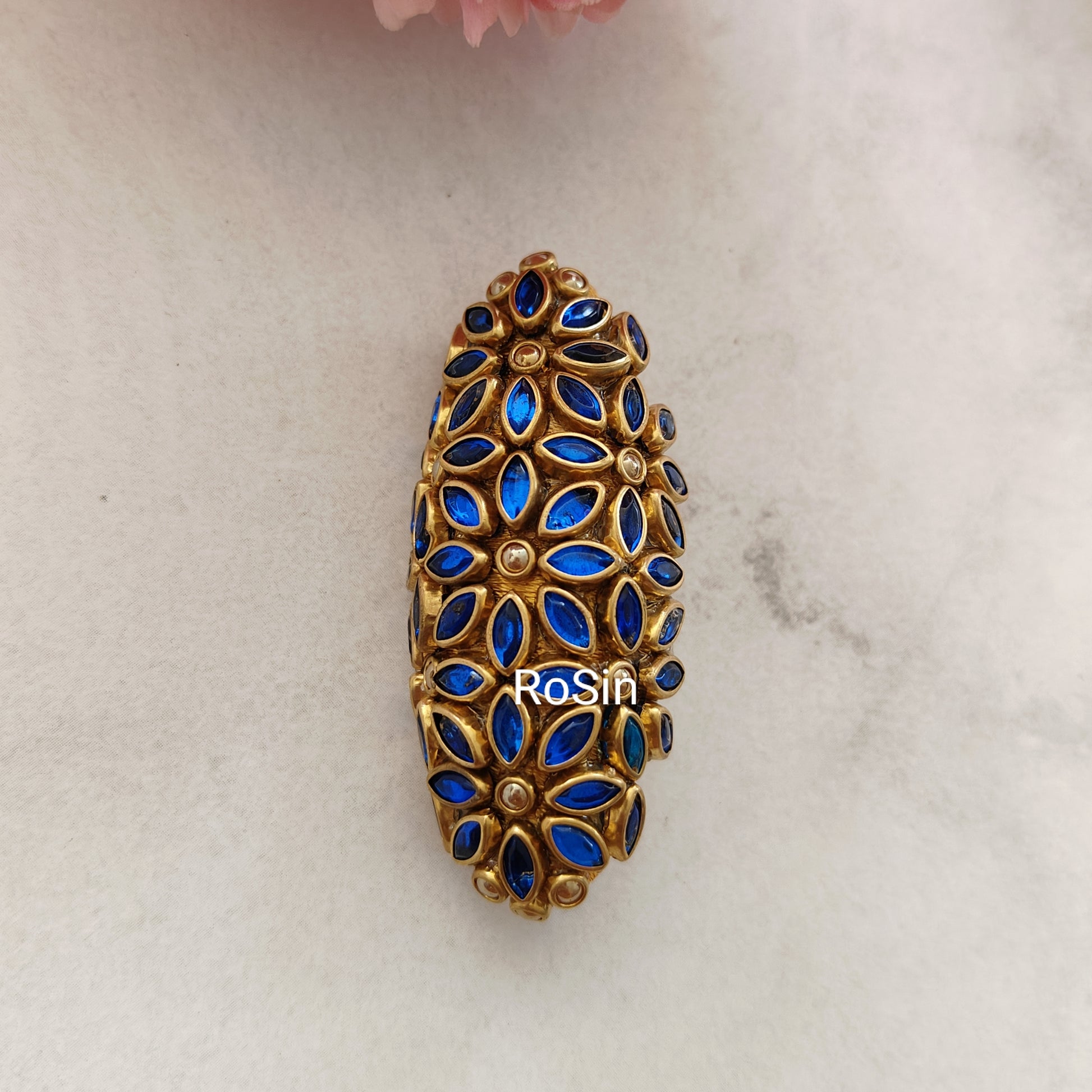 Accentuate your saree with our Floral Dark Blue Saree Pin. Crafted with intricate floral detailing and adorned with deep blue accents, this pin adds a touch of elegance and sophistication to your ensemble. Perfect for securing your saree pallu in place with style, it's a versatile accessory that enhances the beauty of any saree.