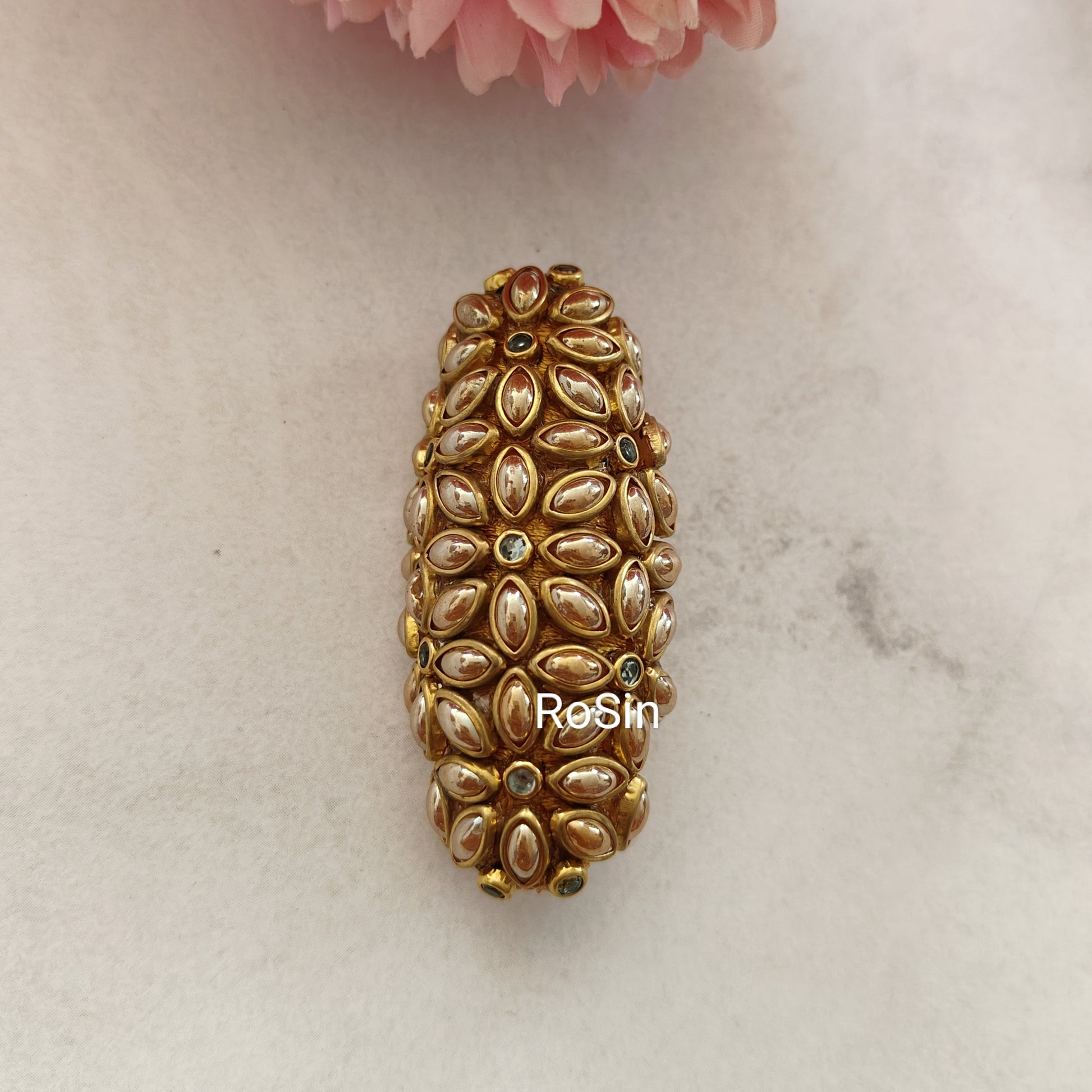 Add a touch of sophistication to your saree with our Lily Golden Pearl Saree Pin. Featuring a delicate lily design adorned with shimmering pearls in a golden hue, this pin is both elegant and versatile. Perfect for securing your saree pallu with style, it effortlessly enhances your ethnic ensemble, making it ideal for special occasions and everyday wear alike.