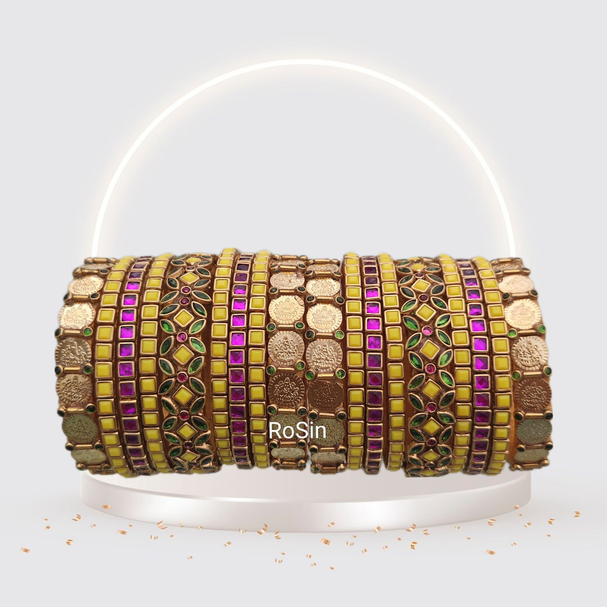 Add a pop of color to your ensemble with our Coin Yellow and Pink Bangles. These bangles feature vibrant yellow and pink hues, adorned with coin accents for a playful yet stylish look. Perfect for adding a touch of charm to any outfit.