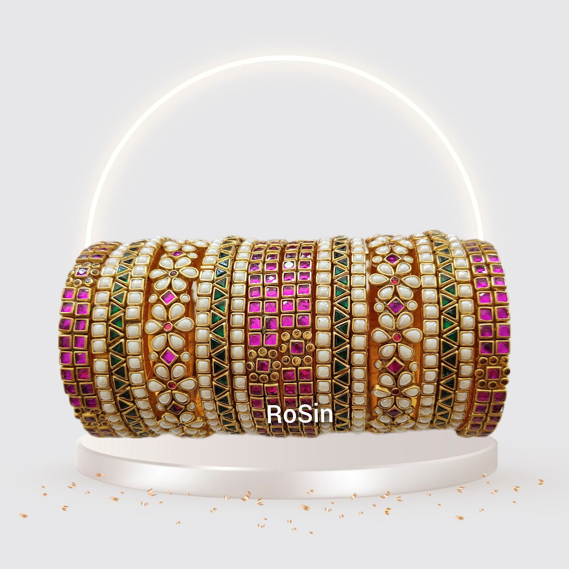 These bangles feature a beautiful floral design in dark pink and green, adding a touch of elegance to any outfit. Made with expert craftsmanship, they are a versatile accessory that can elevate your style. Enhance your wardrobe with these unique and sophisticated bangles.