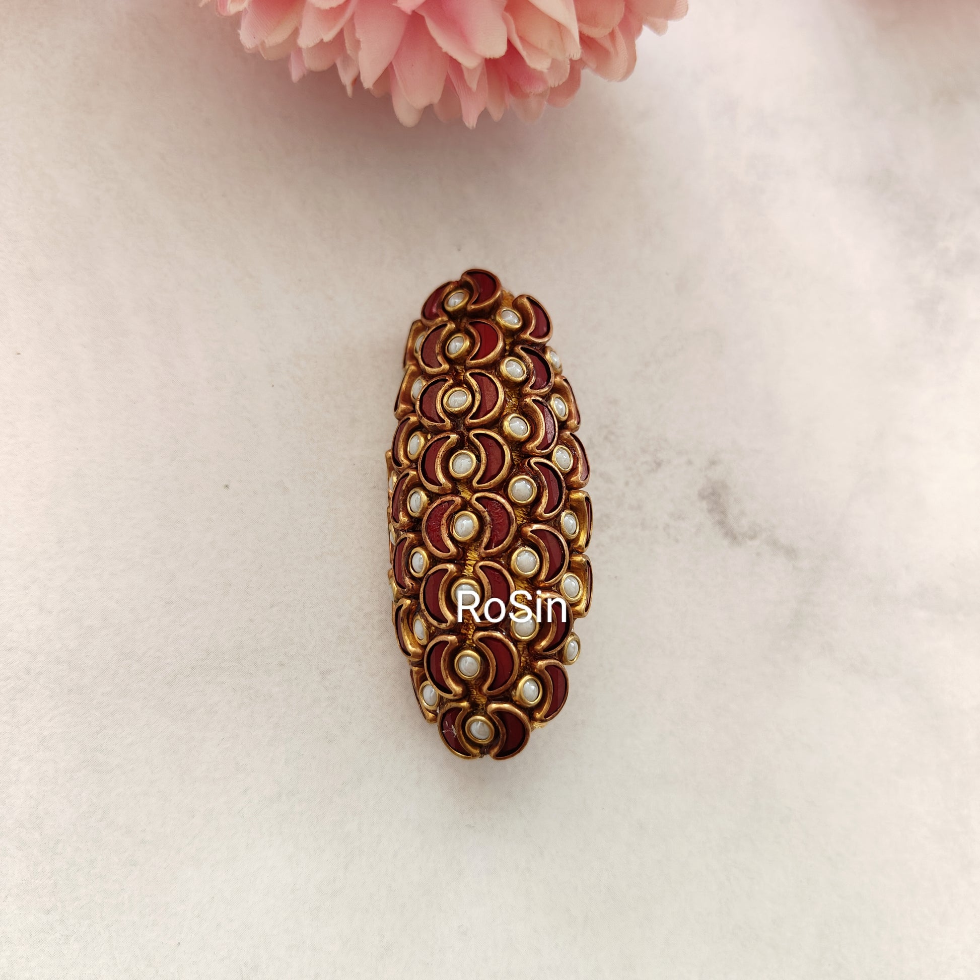Introducing our Moon Maroon Saree Pin, a stylish accessory to elevate your saree ensemble. Crafted with intricate detail, this pin features a moon-shaped design in a rich maroon hue, adding a touch of elegance and sophistication to your drape. Perfect for securing your saree pallu in place with flair, it's a must-have addition to your ethnic jewelry collection.